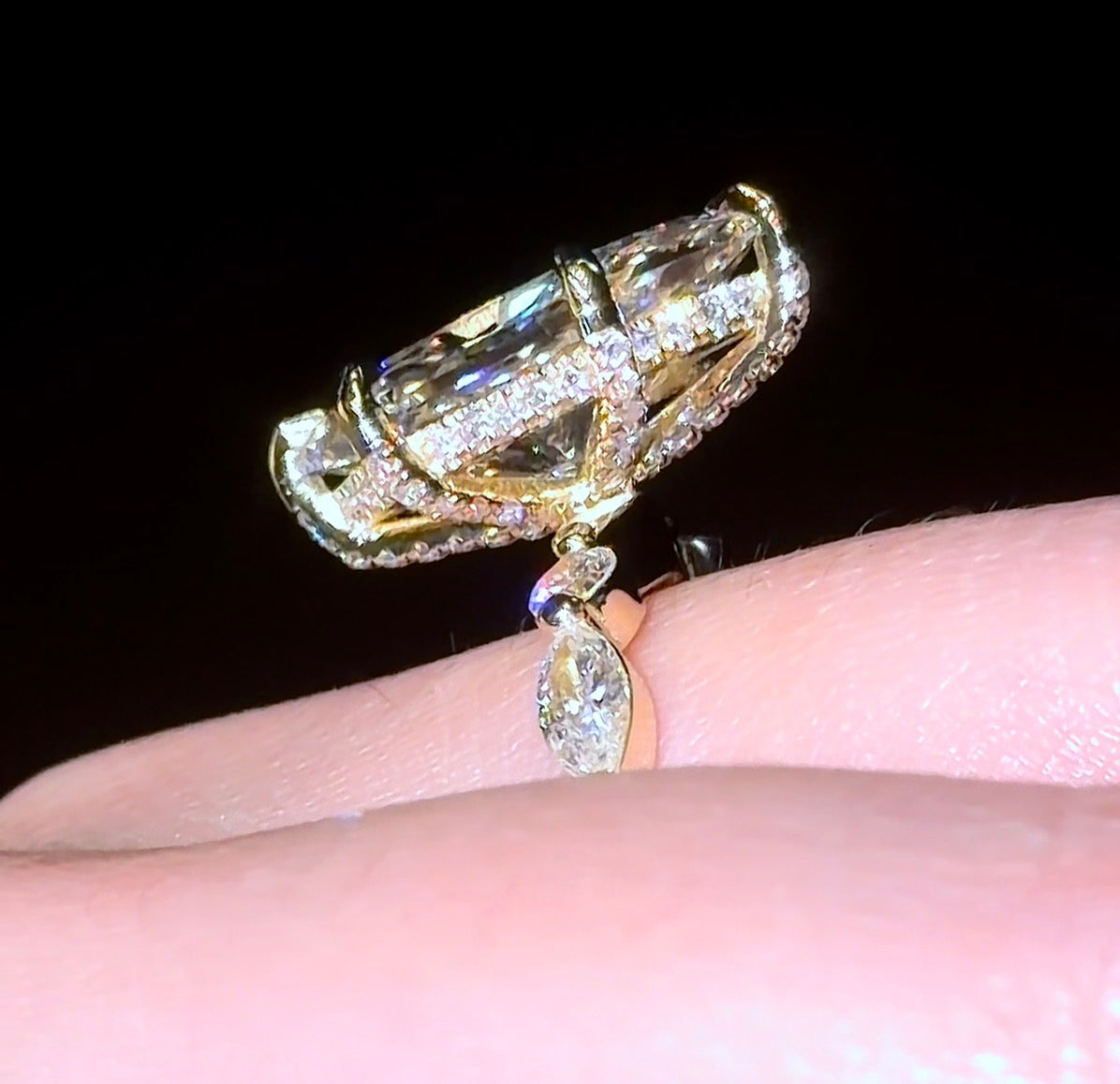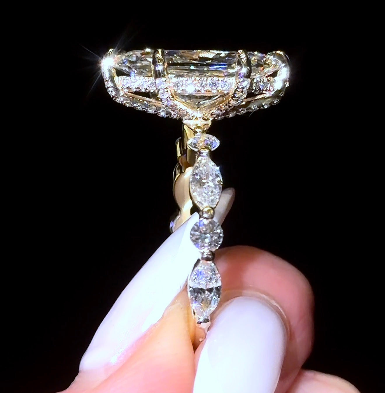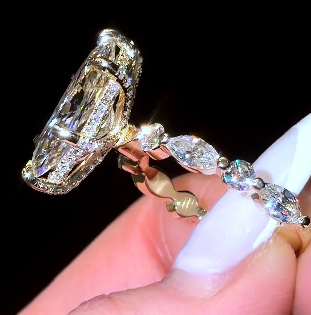 Our "Dutchess 2” Ring, features a Dutch Marquise Diamond with Pavé Prong on a Round/Marquise Bubble Band. The 5ct Version featured in the photo is on a 2.8mm Band.