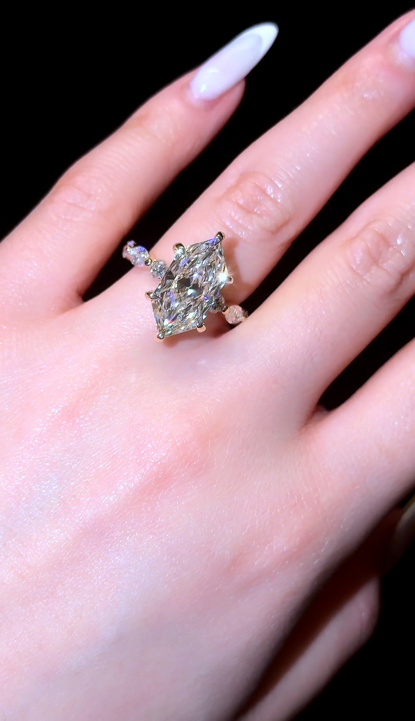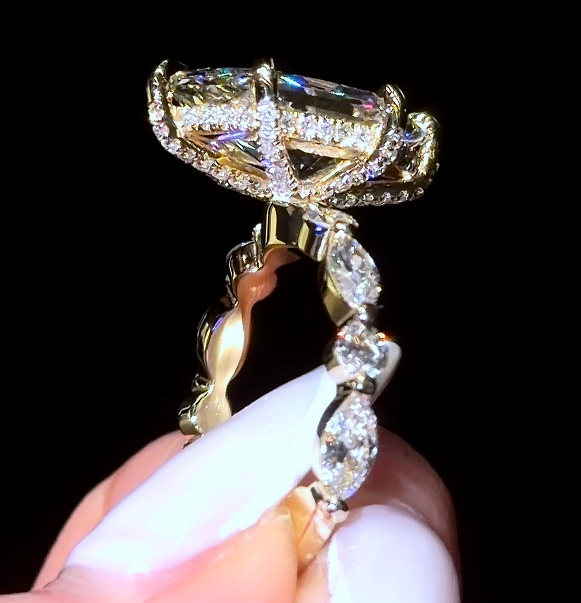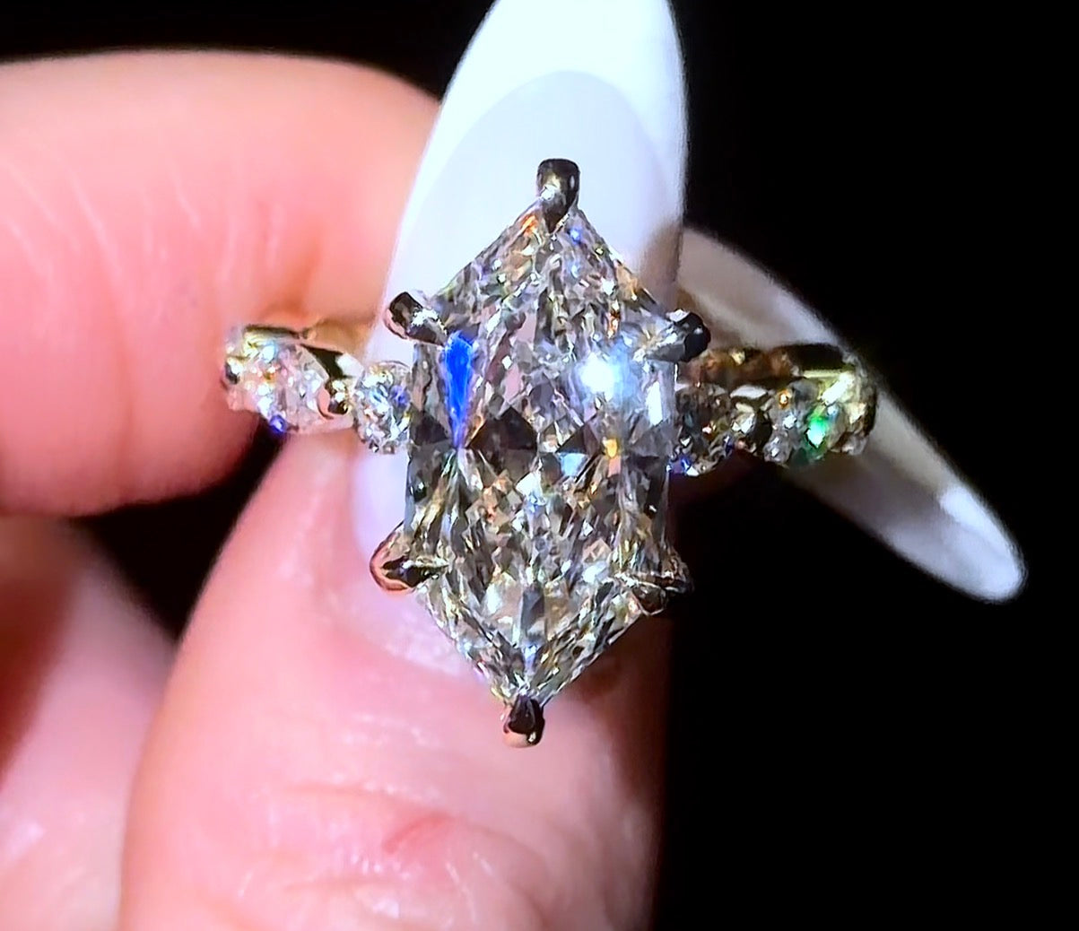 Our "Dutchess 2” Ring, features a Dutch Marquise Diamond with Pavé Prong on a Round/Marquise Bubble Band. The 5ct Version featured in the photo is on a 2.8mm Band.