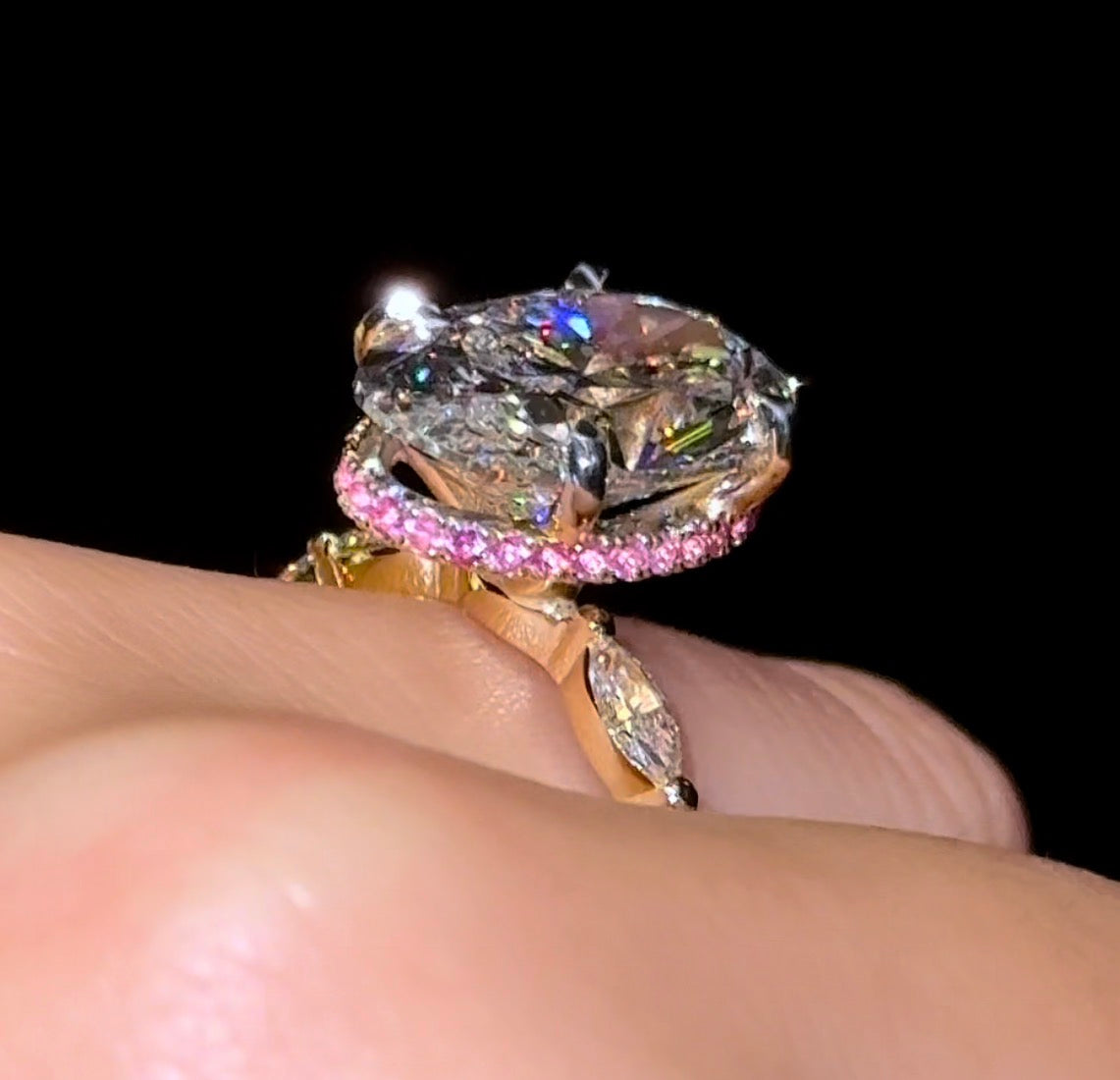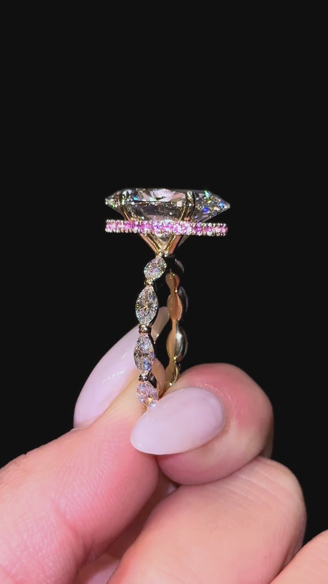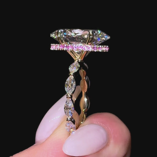 Our "Krista’s Halo” Ring, features an Oval Diamond with a Pink Hidden Halo set on a Marquisd Bubble Band. The 8ct Version featured in the photo is on a 2.8mm Band.