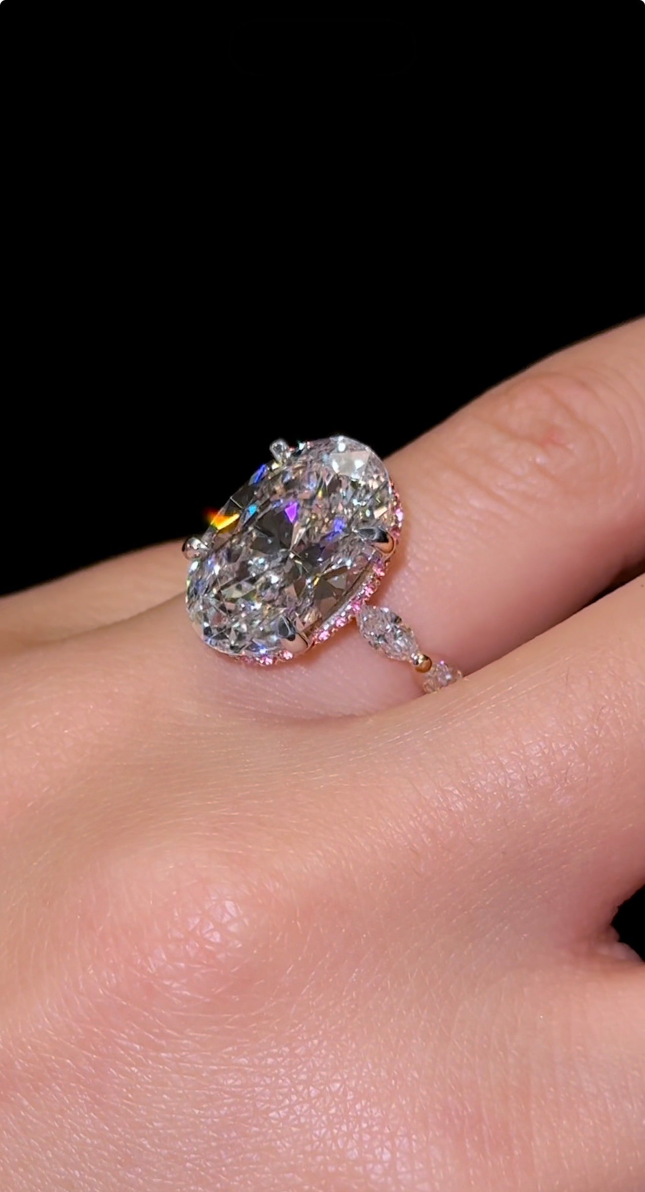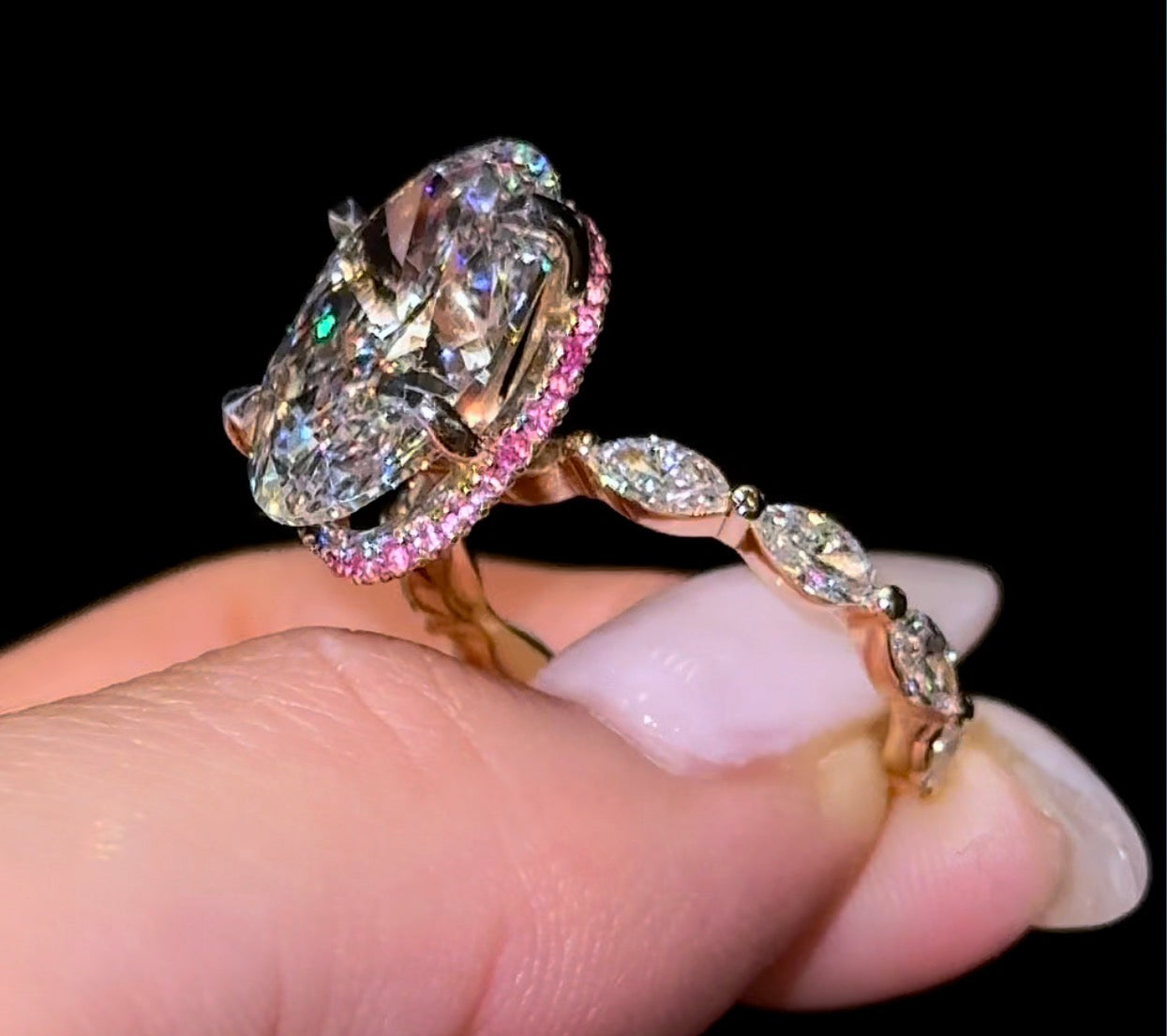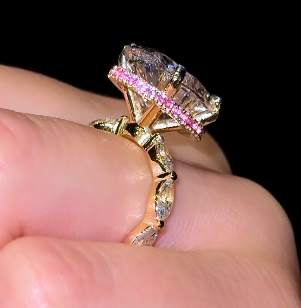 Our "Krista’s Halo” Ring, features an Oval Diamond with a Pink Hidden Halo set on a Marquisd Bubble Band. The 8ct Version featured in the photo is on a 2.8mm Band.