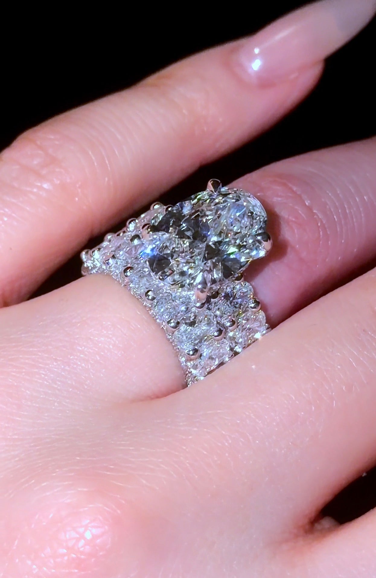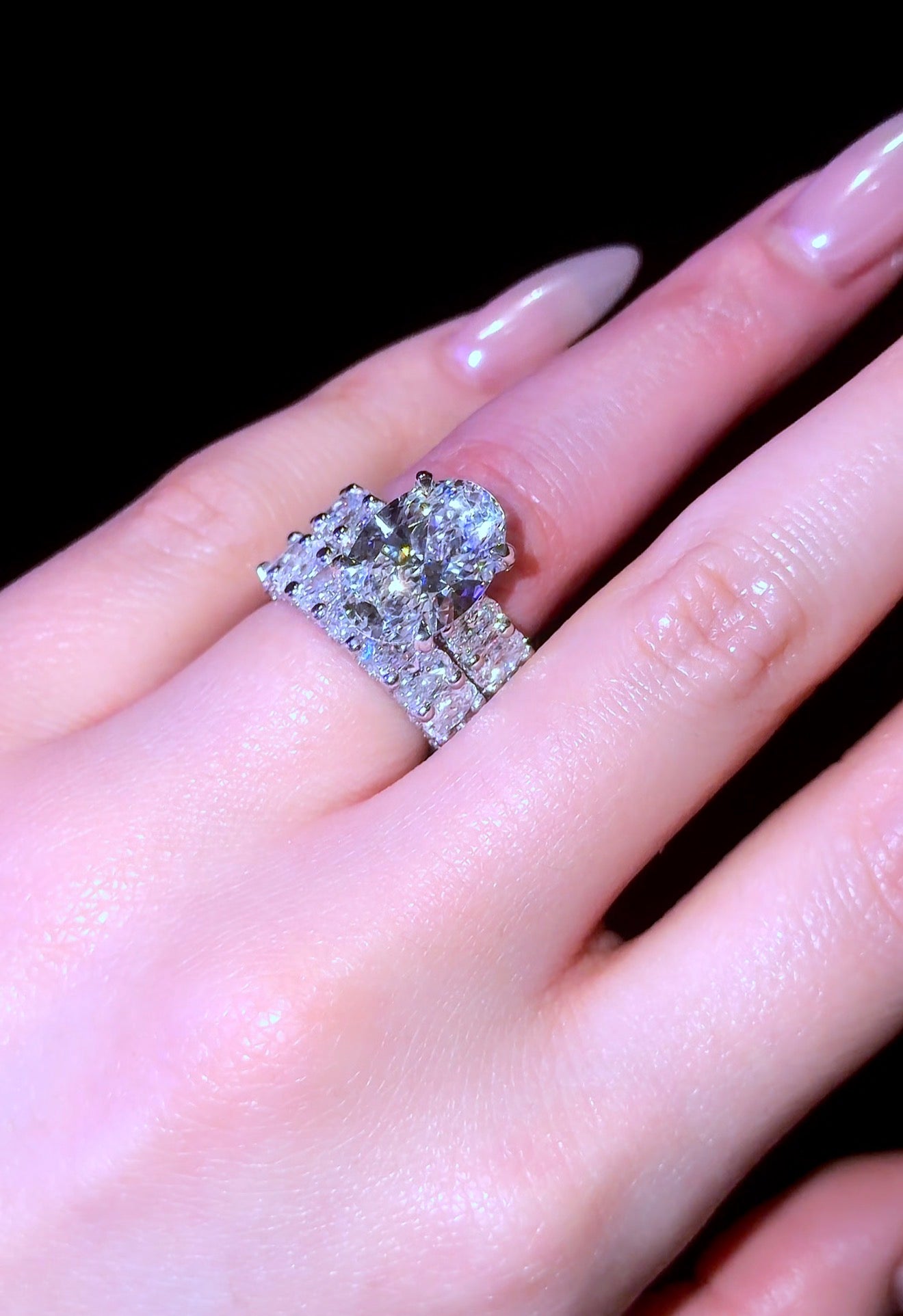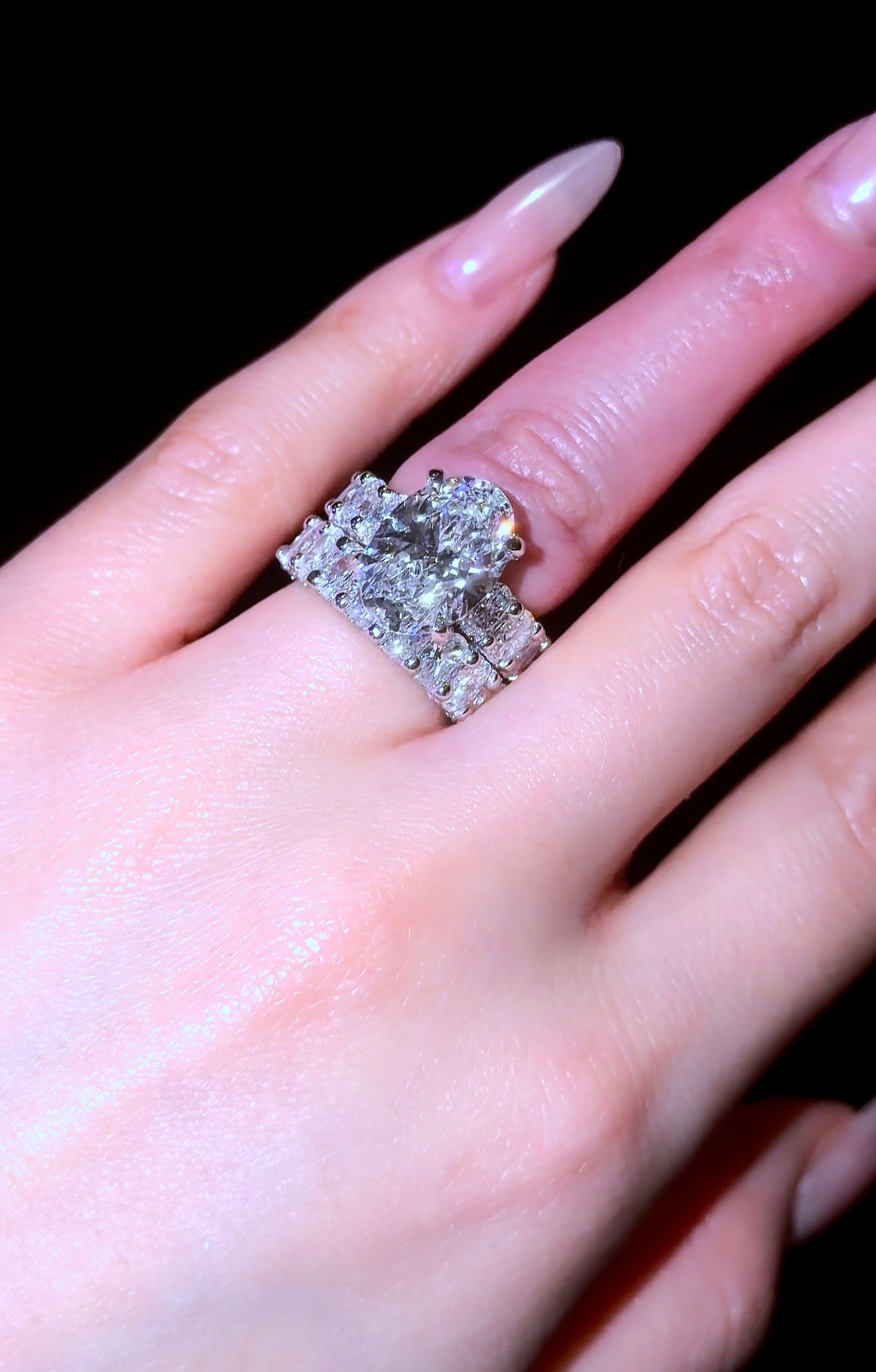 This set features 2 of our most requested rings. Our viral Oval Queen Ring, with 5mm MicroPave Oval Eternity Band and Hidden Halo w/ Pavé Prongs. And the matching 5mm Queen Wedding Band. Each with over 250 little diamonds, covering every inch of the ring.