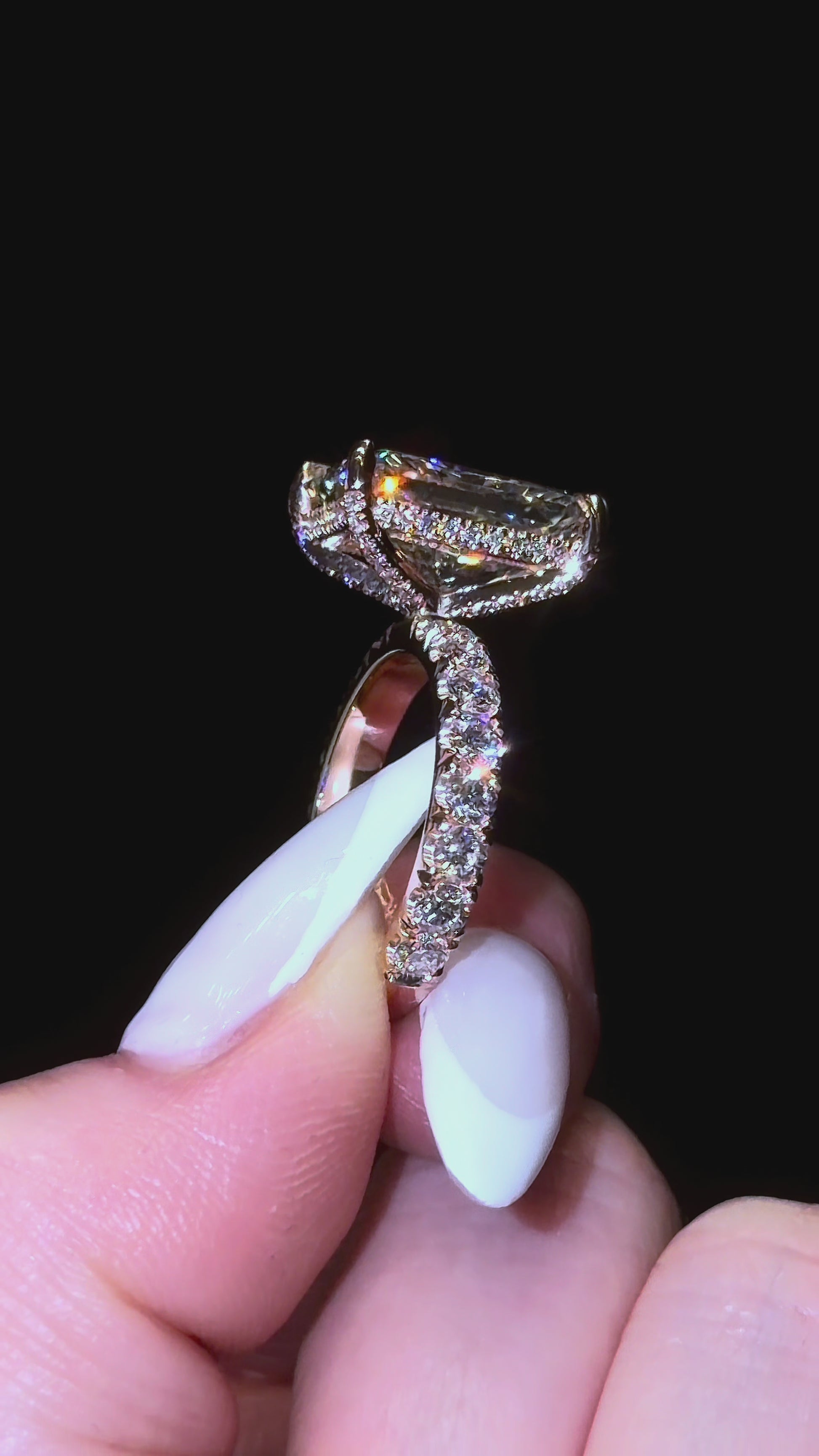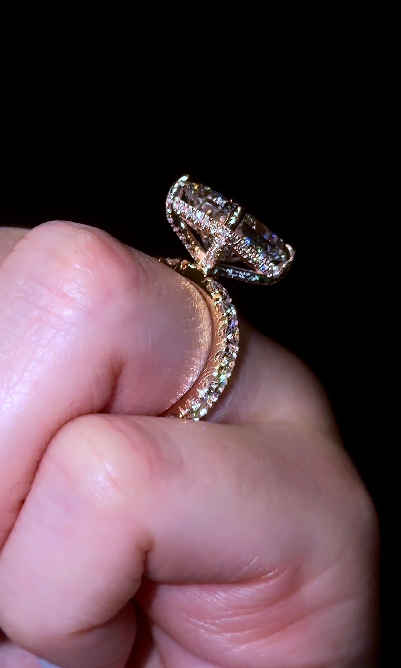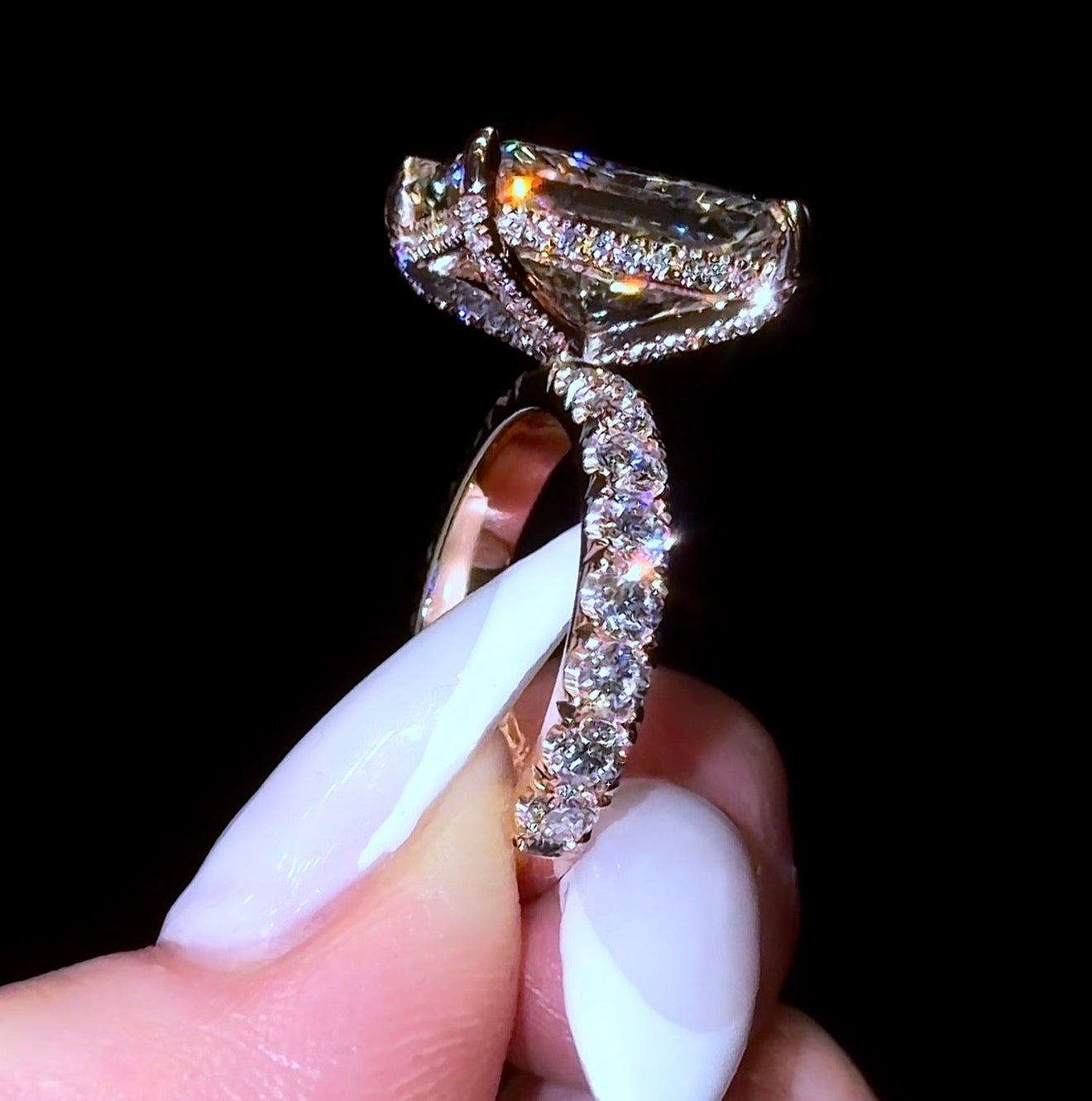 Our "Pavé Everything” Ring, features a Pavé Band & Pavé Prongs. The 6ct Version featured in the photo is on a 2.6mm Band, where as the 4ct Version features a 2.3mm band, to maintain proportions.