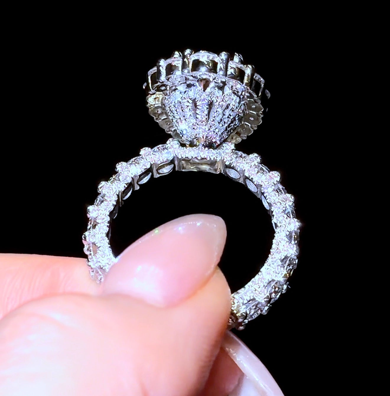 Our viral Traditional Oval Heiress Ring, Features a 2-Row Pavé Traditional Halo wrapping around the Oval diamond, with a MicroPave Round Eternity Band.