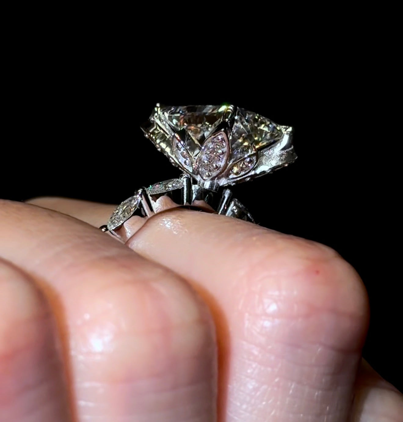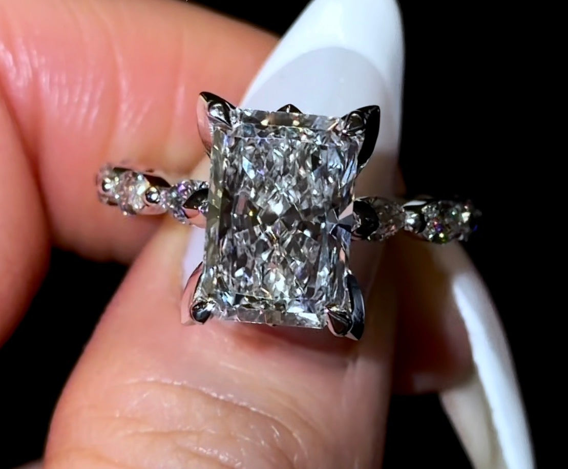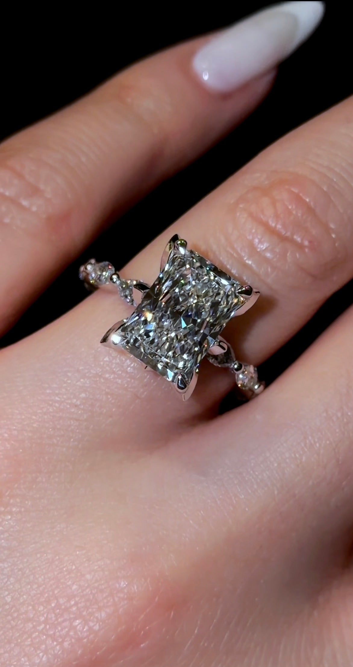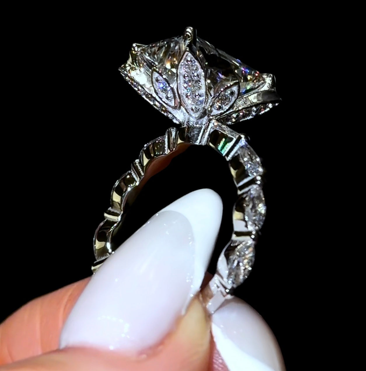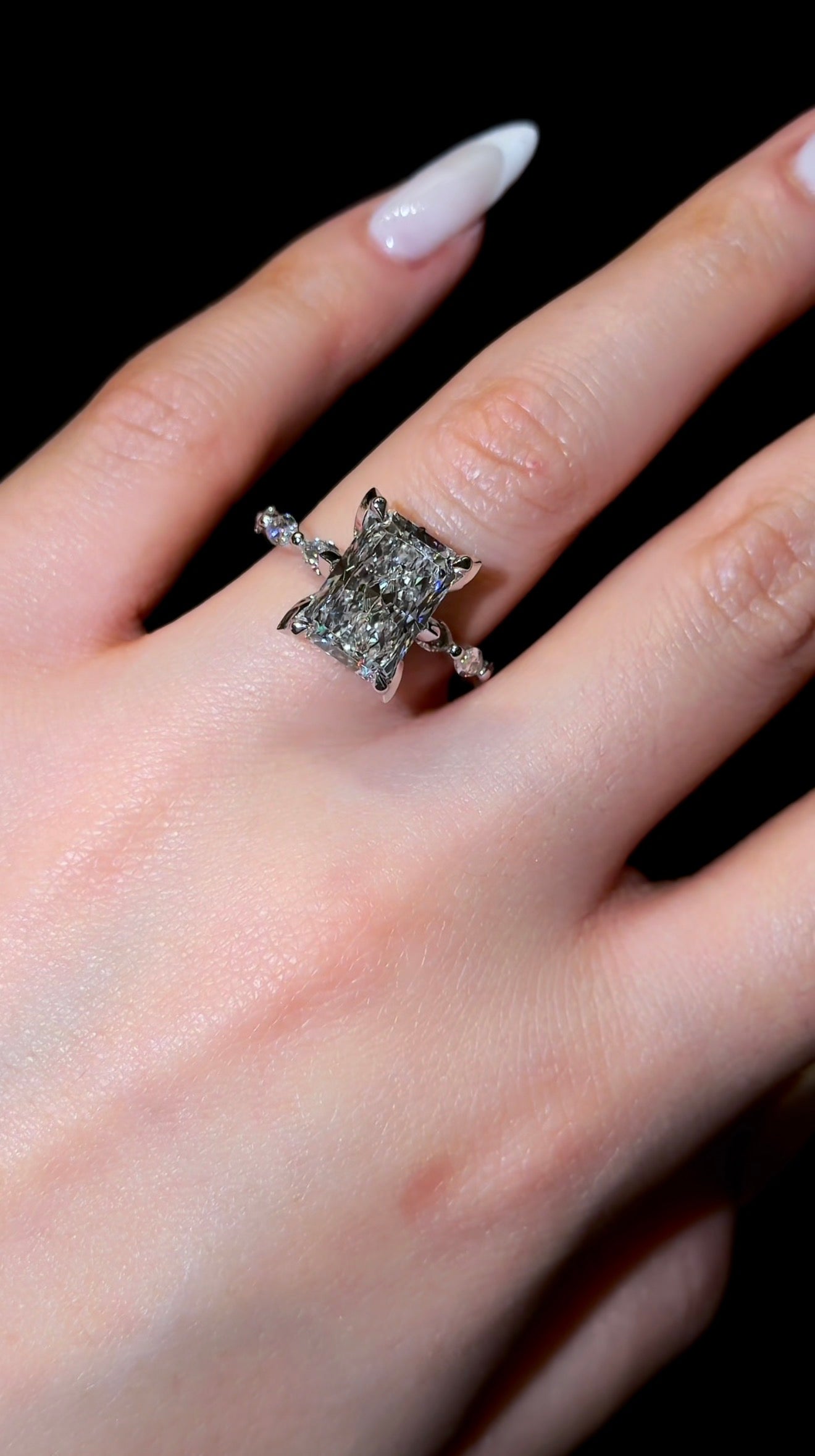 Our "Radiant Tierra” Ring, features a Radiant Diamond with our viral Tierra Diamond Flower Prongs on a Marquise Bubble Band.