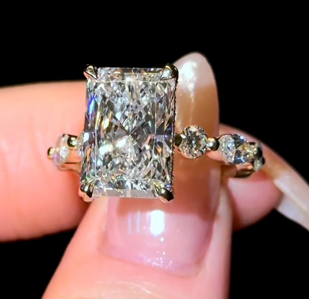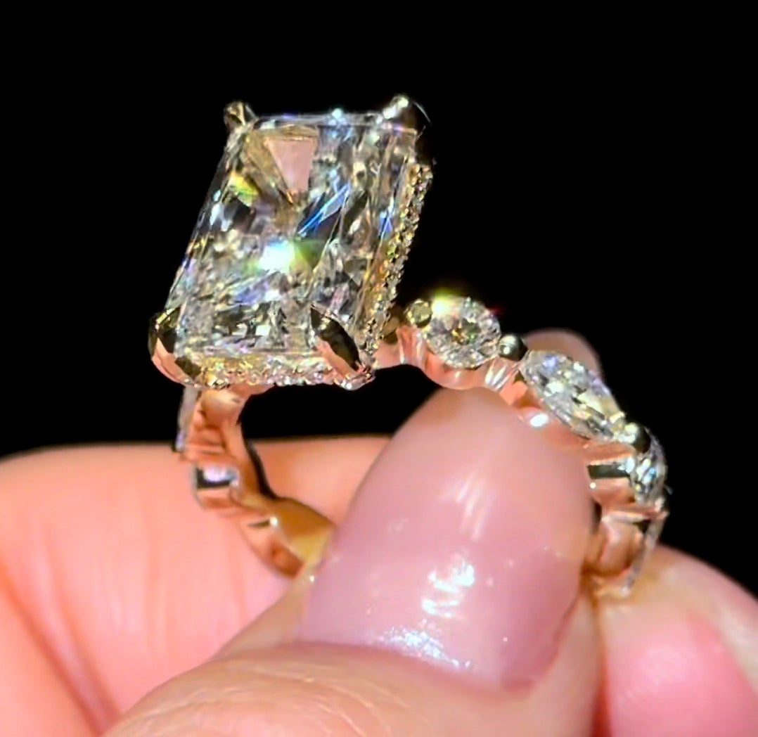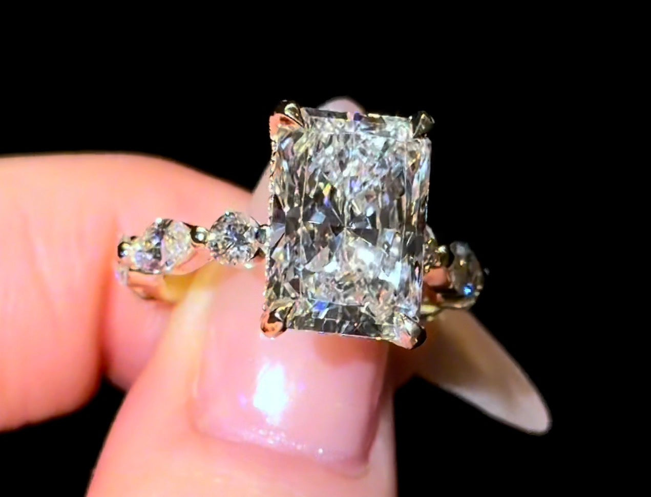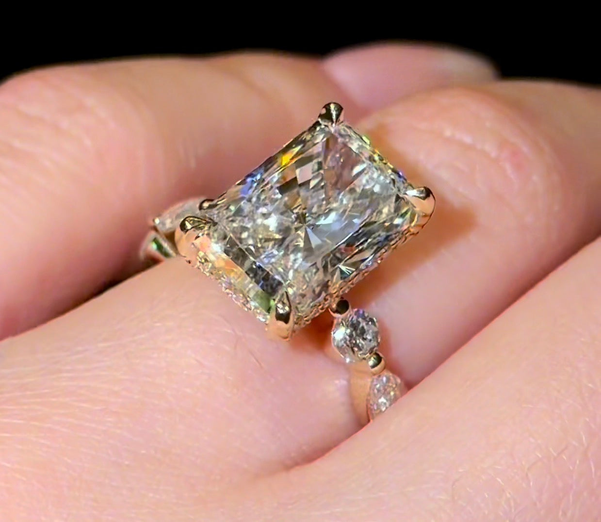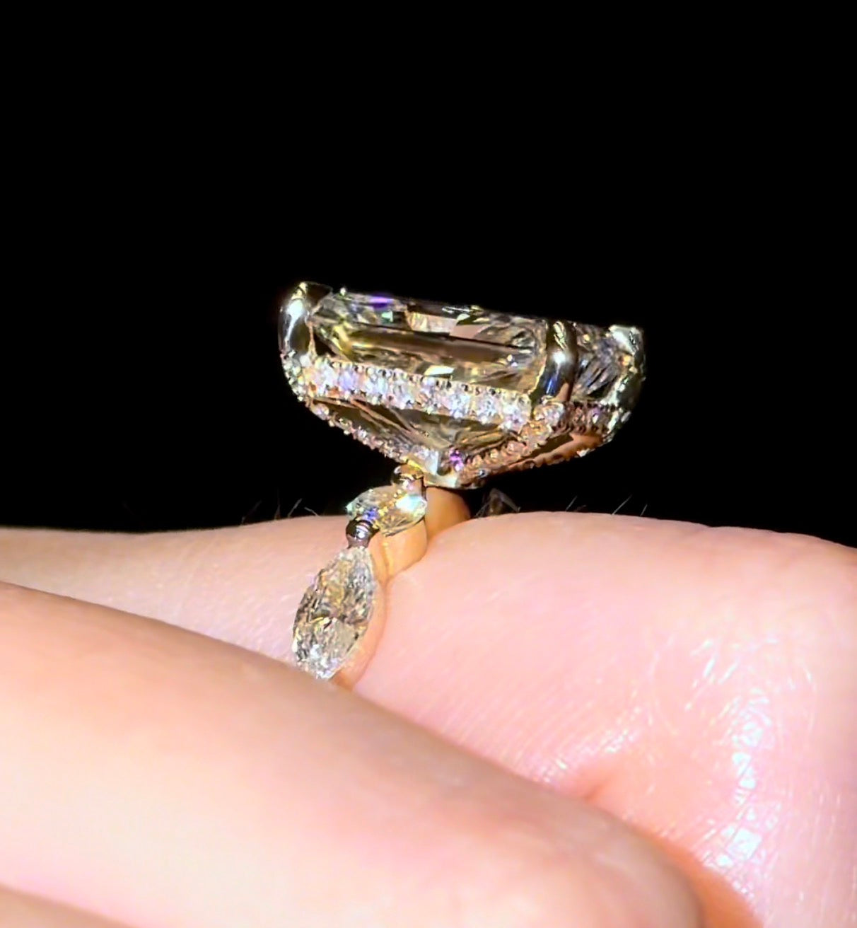 This ring features a Radiant Diamond with Pavé Prongs on a Marquise Bubble Band.