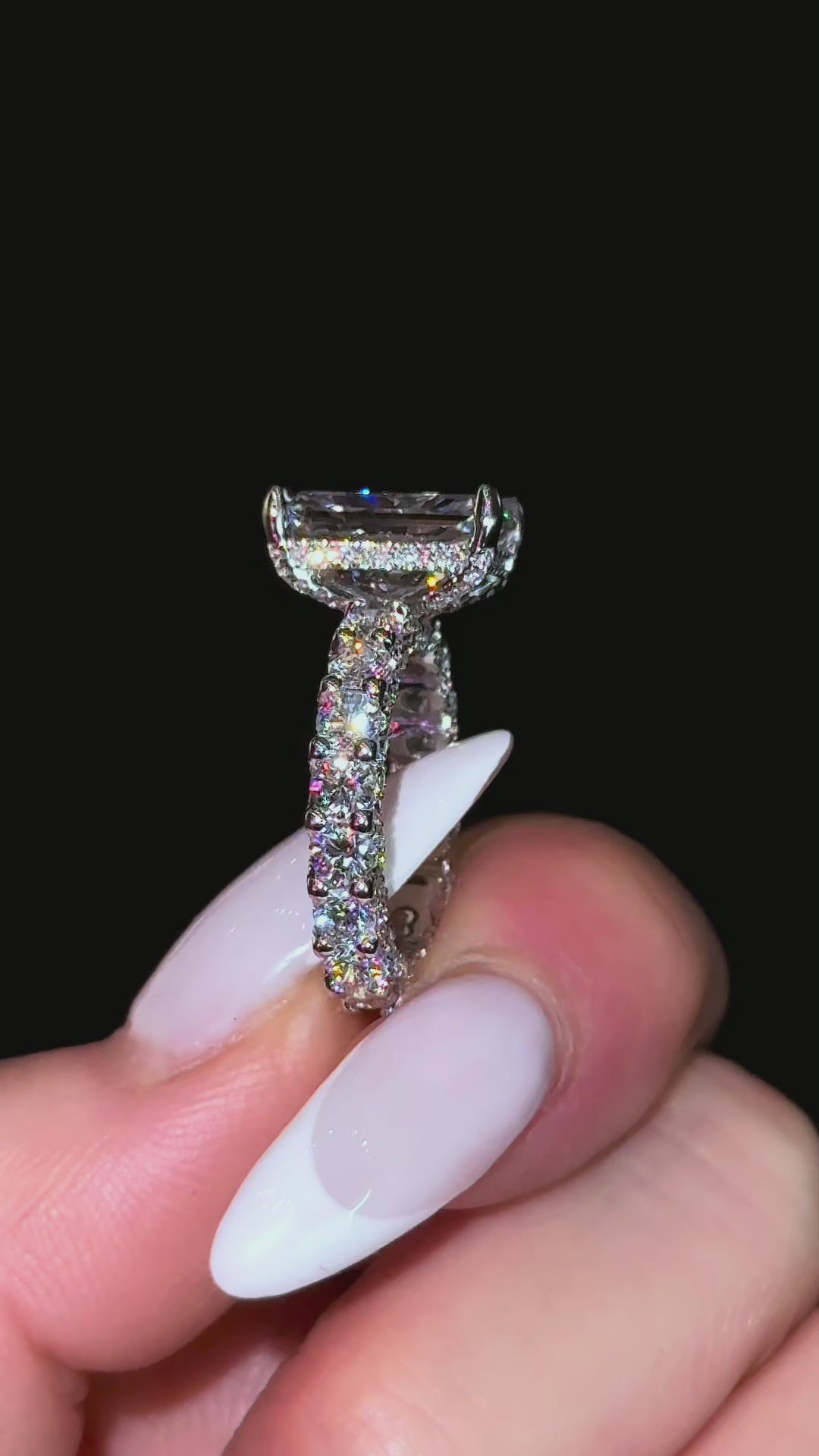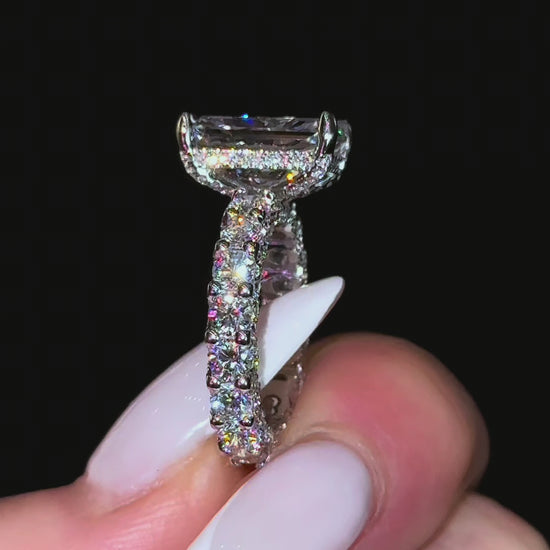 Our viral Radiant Heiress Ring, with MicroPave Round Eternity Band and Pave Prongs.