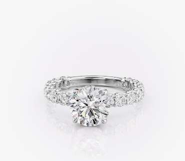 The Adelle mixes the aesthetics of a classic diamond eternity band and an engagement ring. Scalloped pave diamonds are set three quarters across the band to balance comfort, durability, and maximum shine. Fine details like the hidden halo adds a splendid side view to the ring.