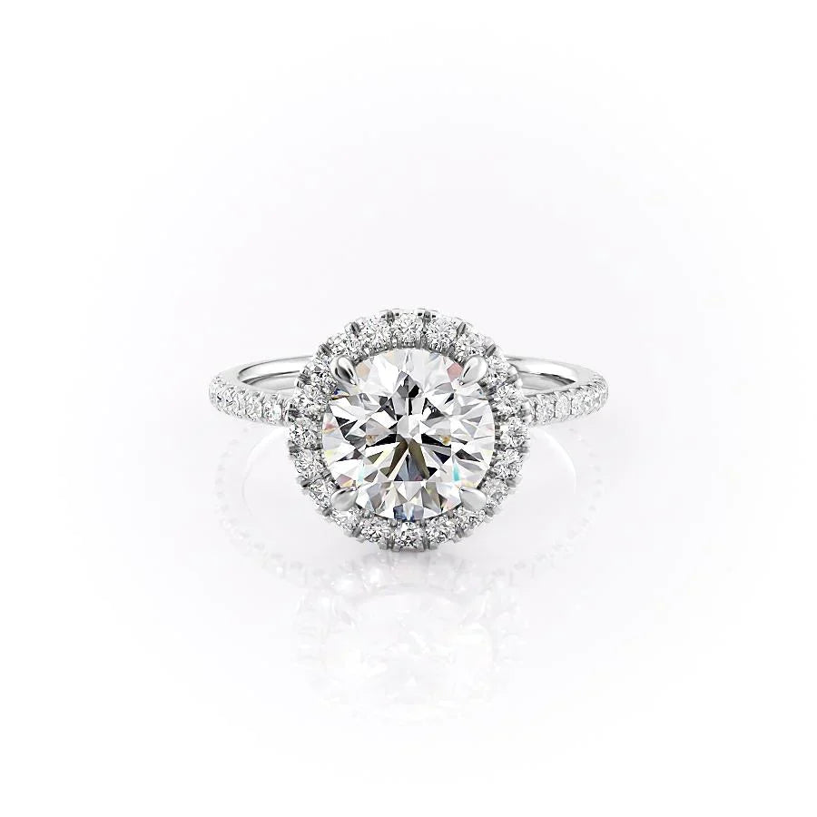 Meet The Lenny, a spectacular diamond halo engagement ring. pave-set diamonds run along the band and extend to X-shaped claws cradling the center stone. A glamorous-but-elegant design with plenty of brilliance and flash.
