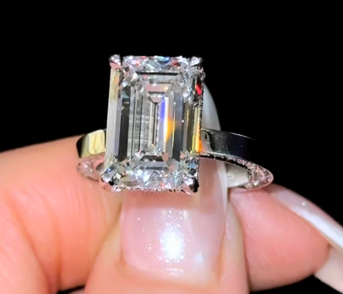 The Emerald version of our viral Ciara Ring, features an Emerald Cut Lab Diamond set in our signature Diamond Inlay Cigar Band, and held by a Hidden Halo.