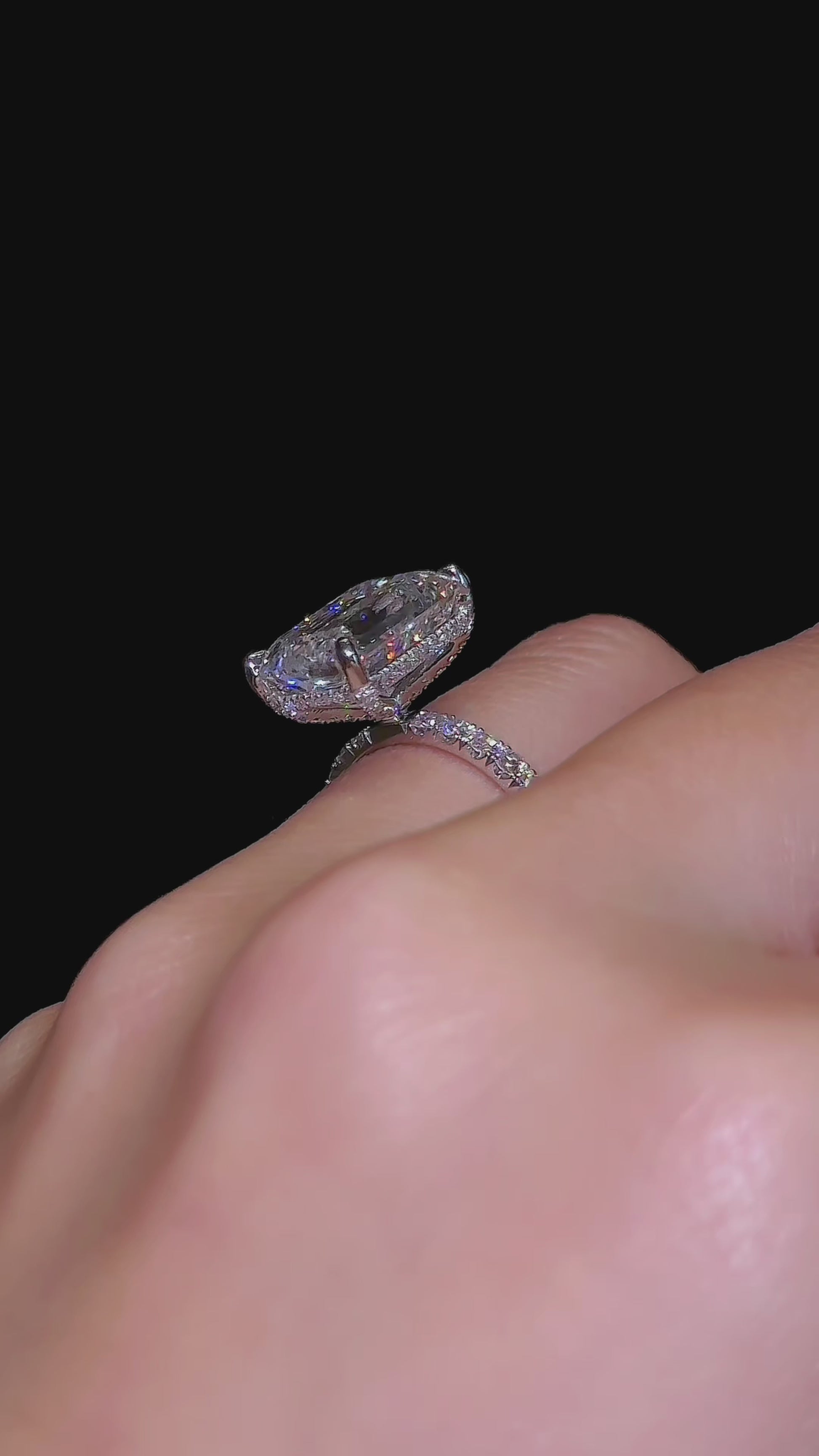 Our "Pavé Everything” Ring, features a Pavé Band & Pavé Prongs. The 7ct Version featured in the photo is on a 2.3mm Band, however, you can request a different width if necessary.