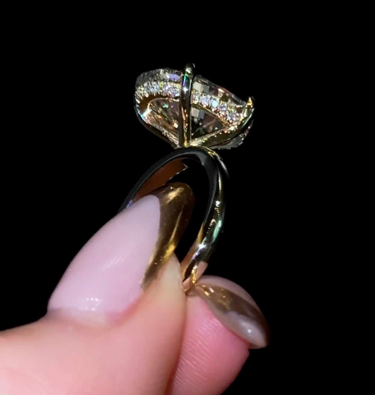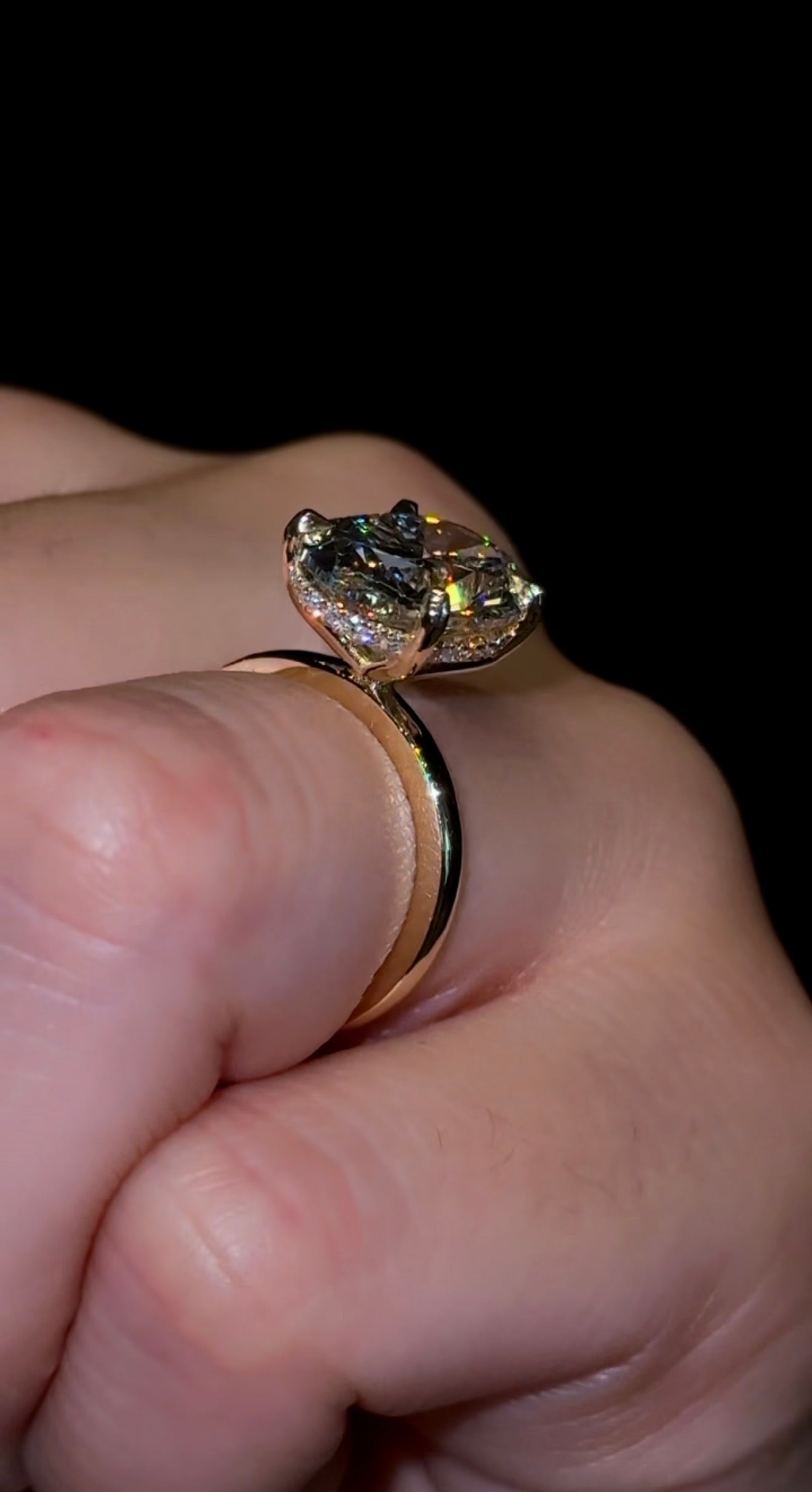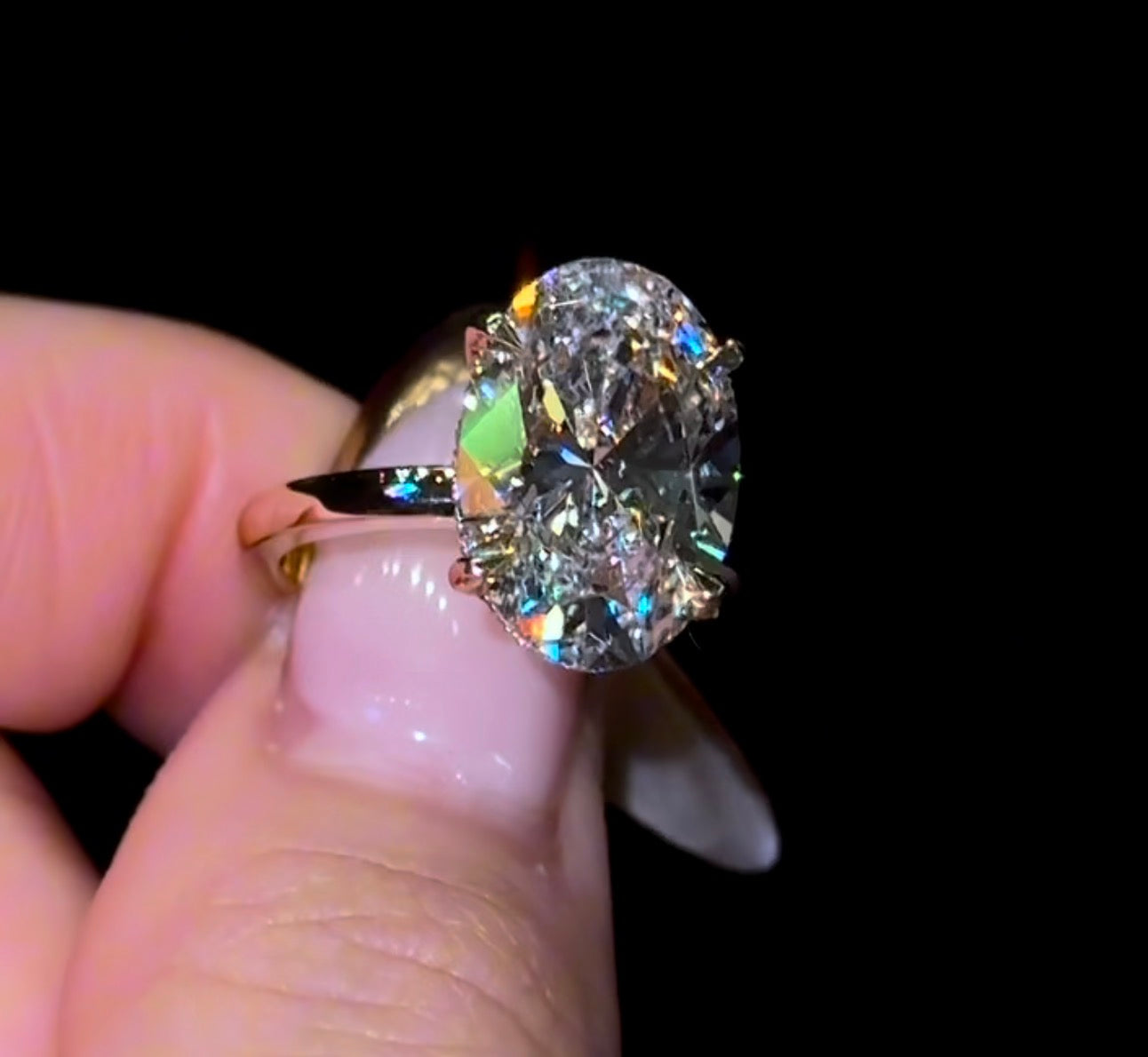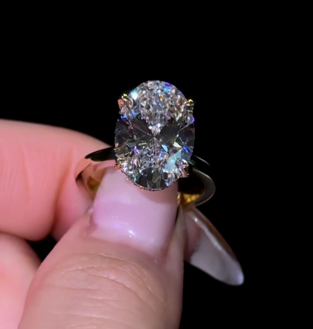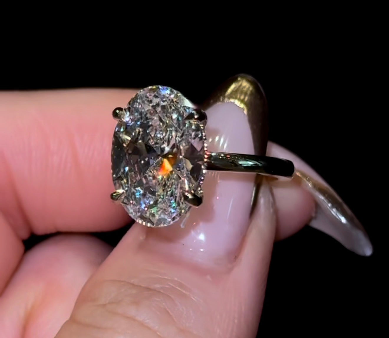 我们的“隐藏光环”戒指,采用2.2毫米的素圈镶嵌椭圆形钻石,并带有隐藏光环。