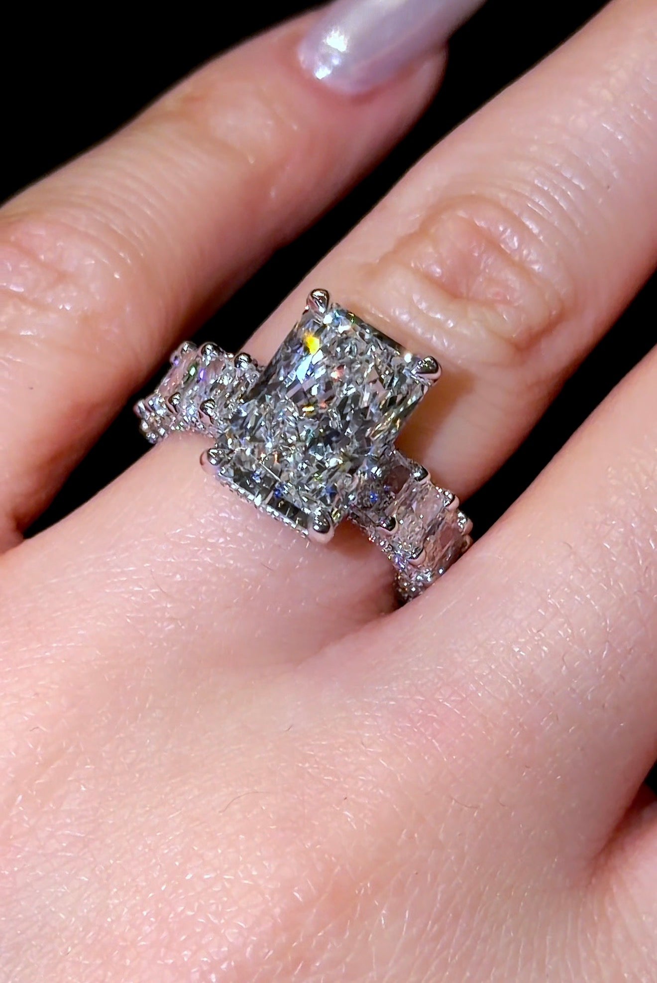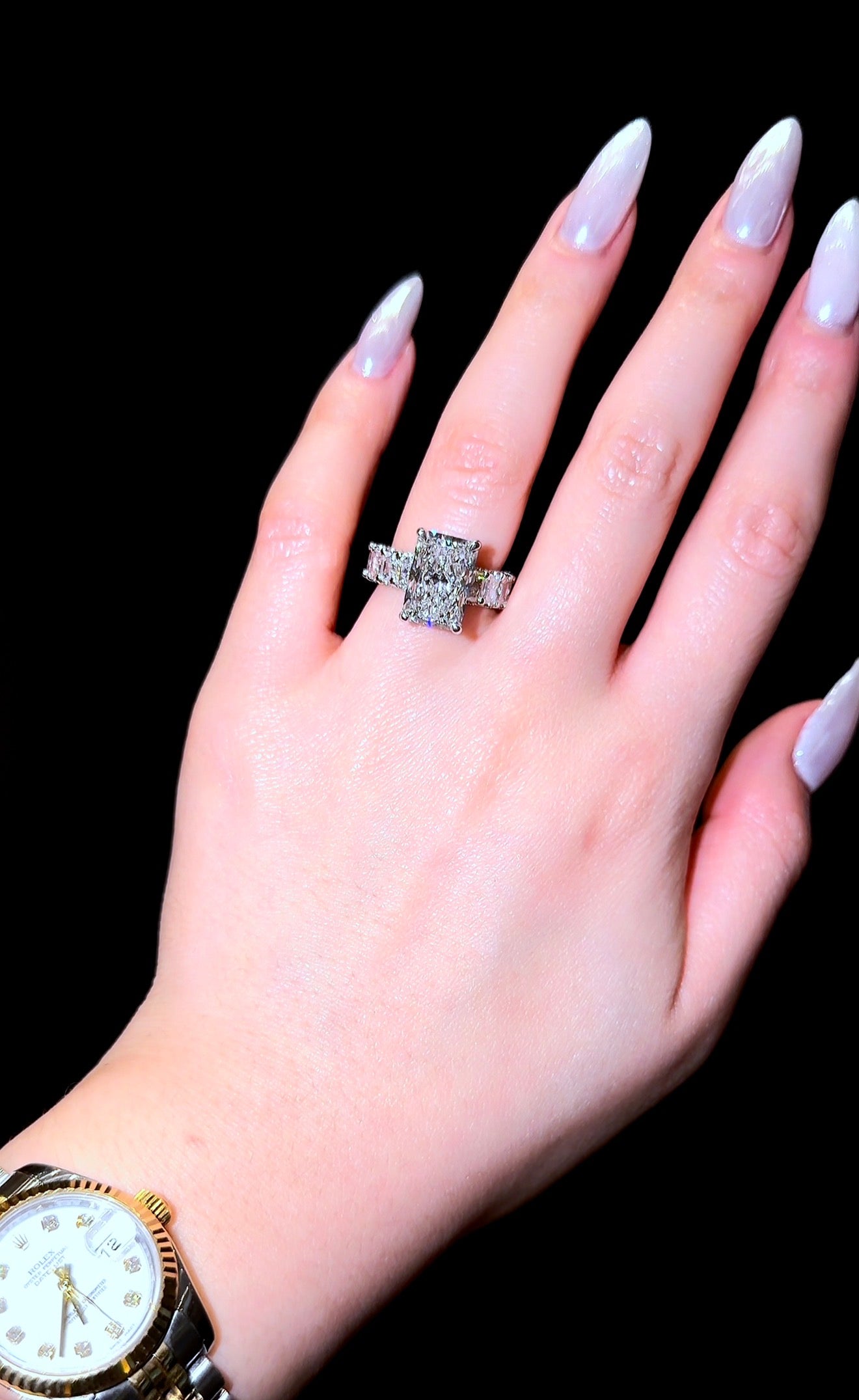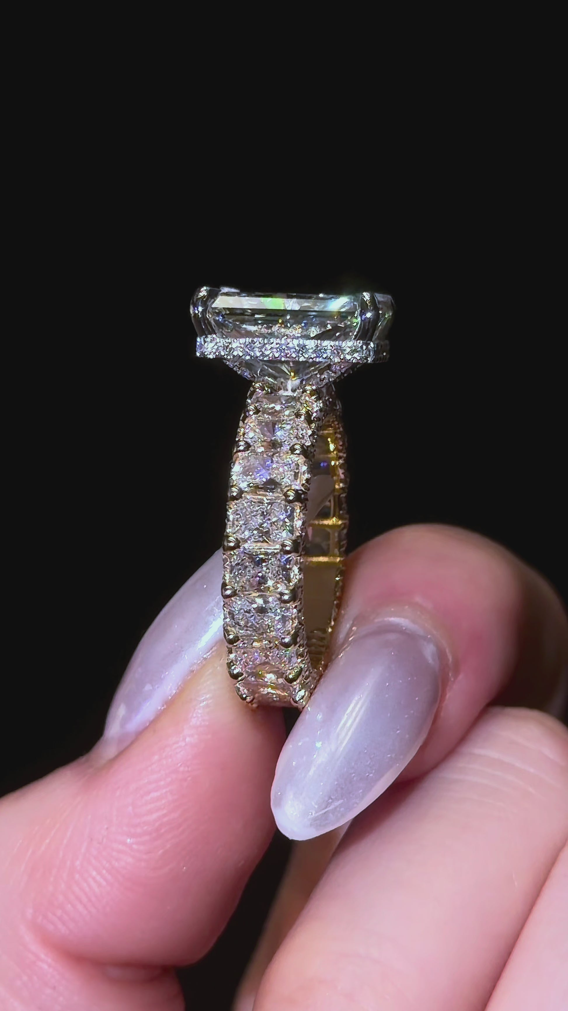 我们这款爆款“璀璨女王”戒指,采用微镶璀璨永恒戒圈和隐藏式光环设计,并以密镶爪镶工艺点缀。戒指上镶嵌超过250颗小钻石,覆盖整个戒圈。戒圈宽度约为4毫米。