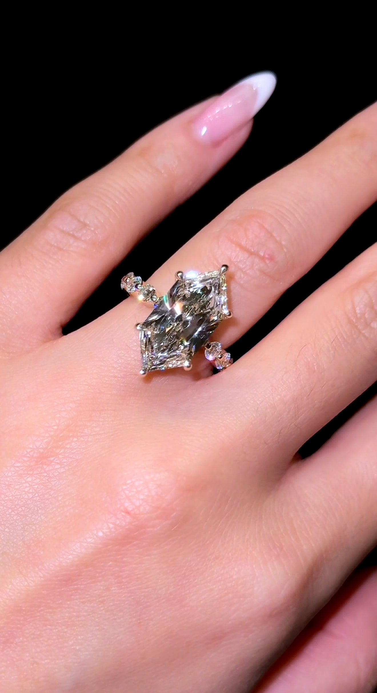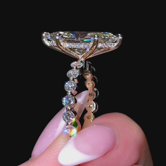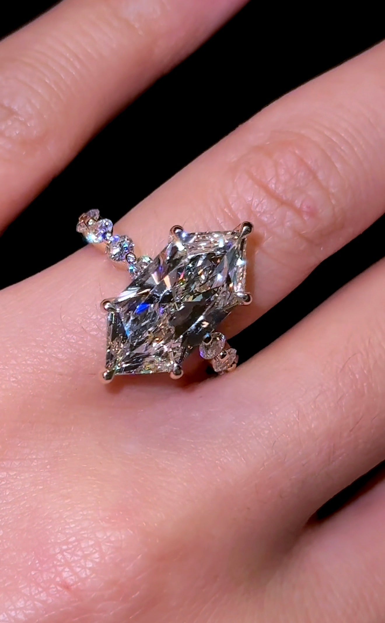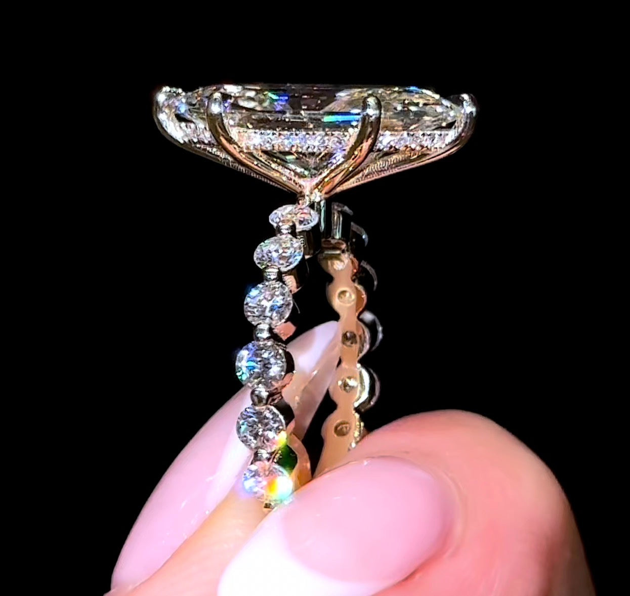 我们的“公爵夫人”戒指,镶嵌一颗荷兰马眼形钻石,周围环绕着隐藏式光环,戒圈为圆形泡泡戒托。照片中展示的5克拉版本,戒圈宽度为2.5毫米。