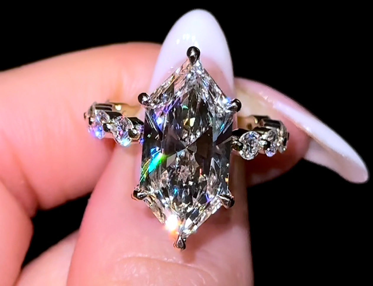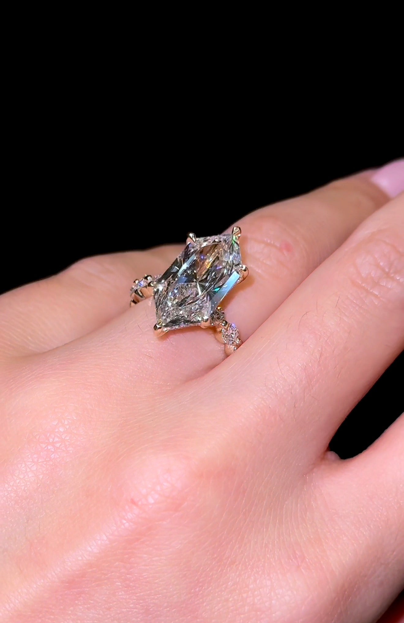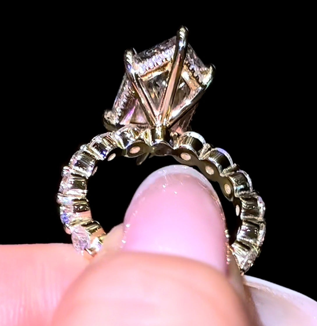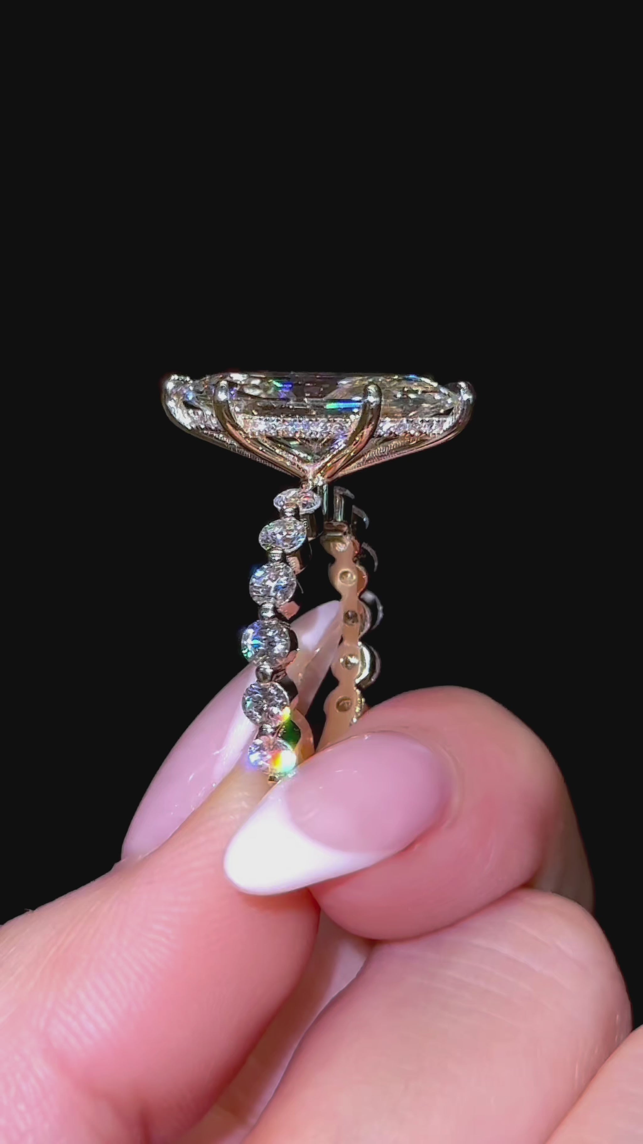 我们的“公爵夫人”戒指,镶嵌一颗荷兰马眼形钻石,周围环绕着隐藏式光环,戒圈为圆形泡泡戒托。照片中展示的5克拉版本,戒圈宽度为2.5毫米。