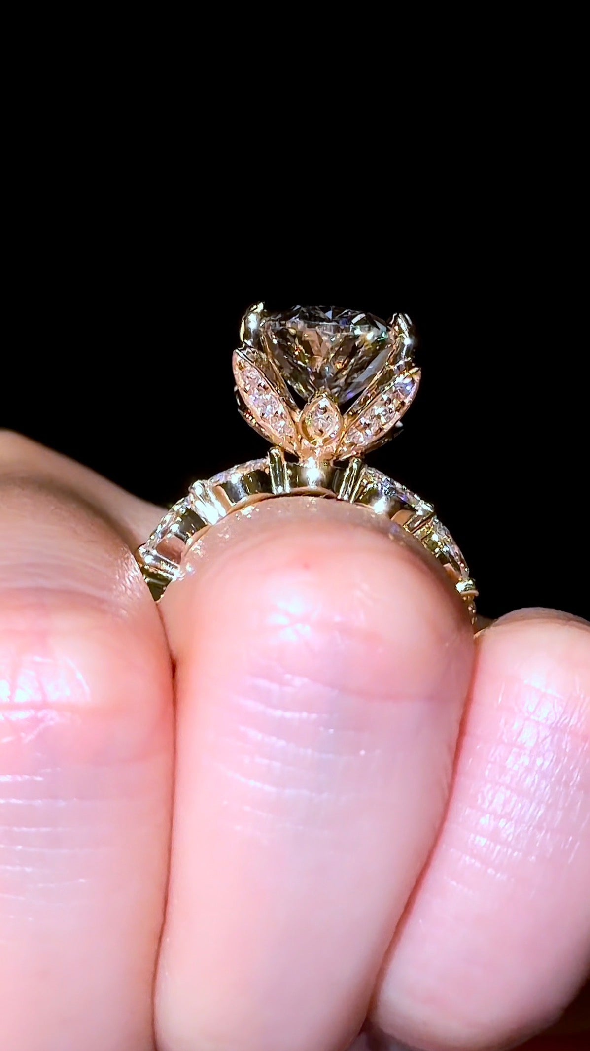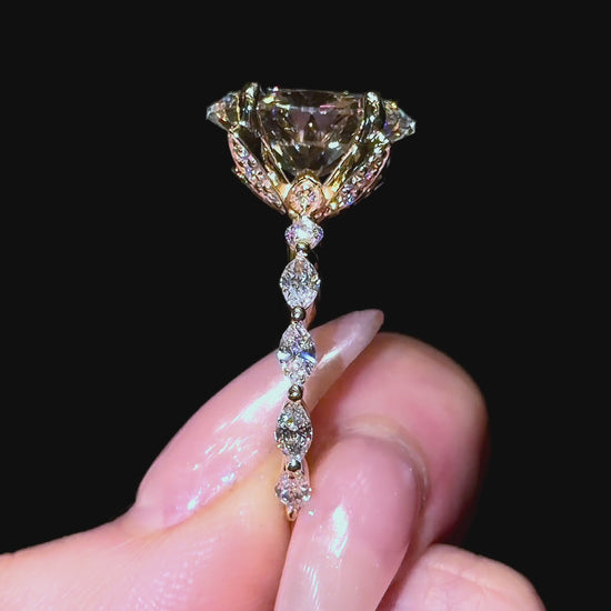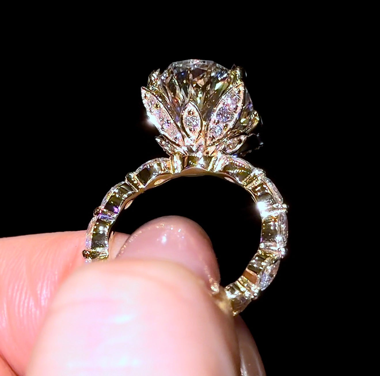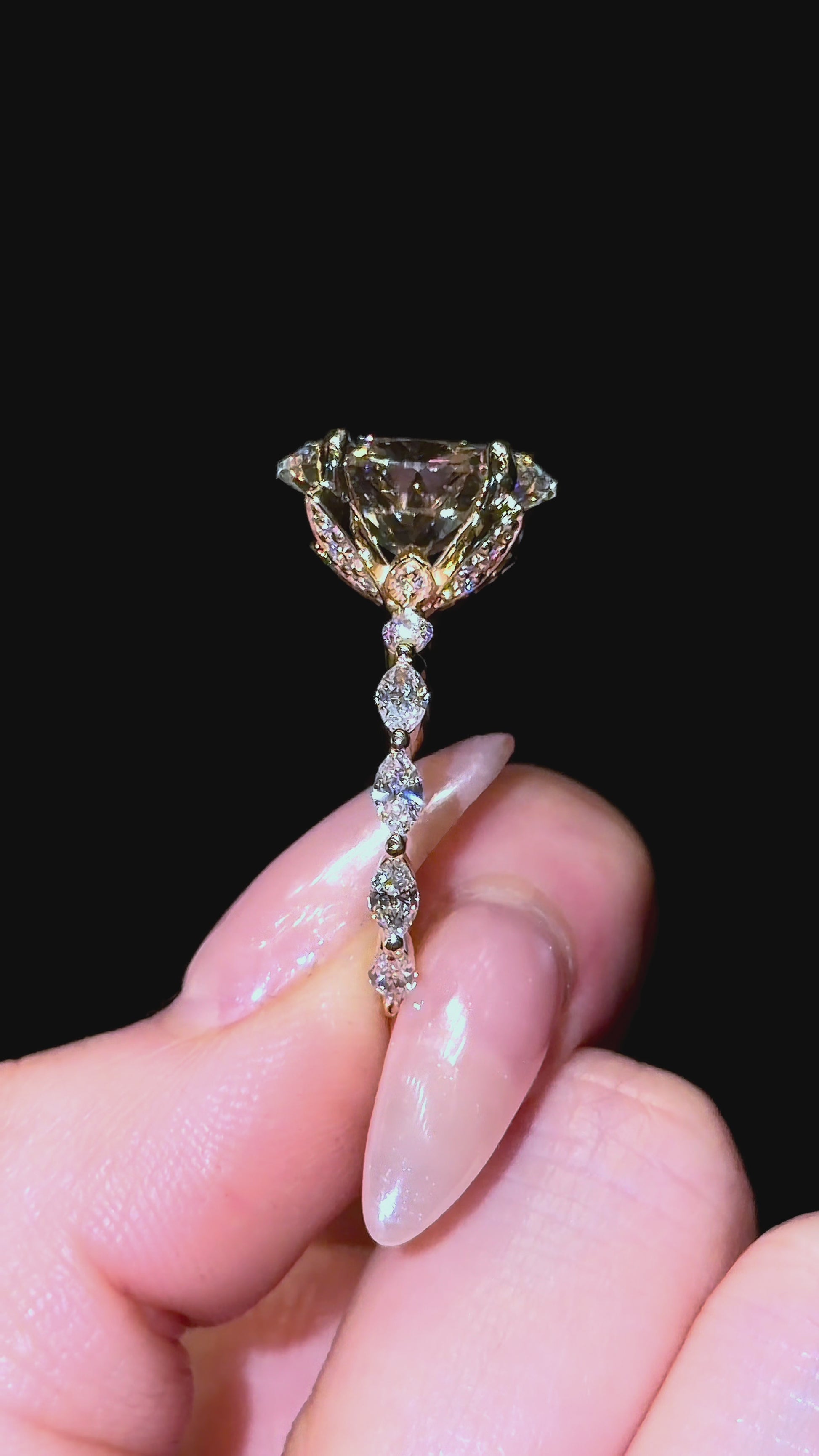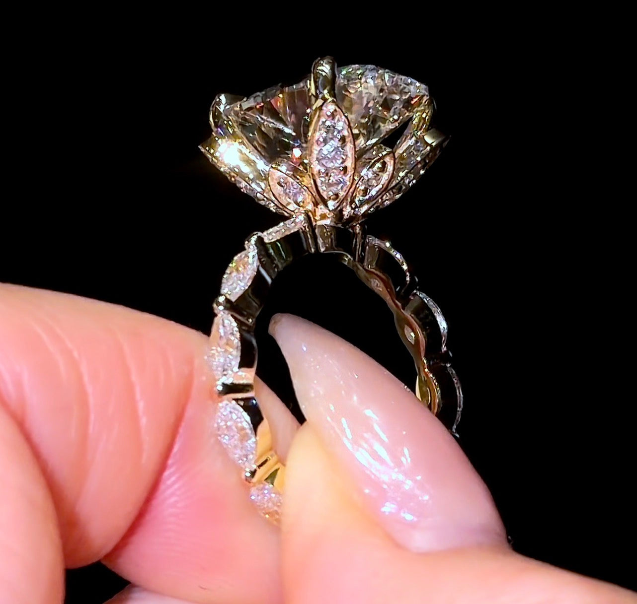 我们爆款的 Tierra 戒指,镶嵌钻石花朵爪镶,马眼形泡泡戒圈。